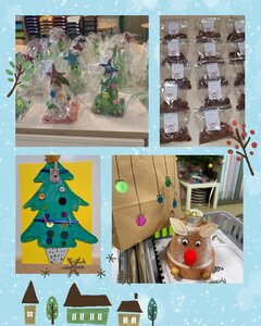 Des sapins de Noël prennent forme, découpés dans du papier coloré et richement décorés de boutons, de paillettes, de gommettes brillantes ou d'étoiles scintillantes.D'adorables rennes naissent à partir de pots en terre cuite peints, auxquels on ajoute des yeux mobiles, un nez rouge en pompon et des branchages ou des cure-pipes pour les bois, se transformant parfois en charmantsphotophores avec une petite bougie LED.Des bonhommes de neige ou d'autres petites figurines festives sont modelés et peints, puis soigneusement emballés dans du papier transparent, prêts à être offerts.Des sacs cadeaux en papier kraft sont personnalisés avec des dessins de boules de Noël ou d'autres motifs festifs, parfaits pour emballer les créations ou de petitesgourmandises chocolatées confectionnées pour l'occasion.Des cartes de vœux originales et desbougeoirs dorés (peut-être en pâte à sel ou en argile) complètent cette collection de trésors.